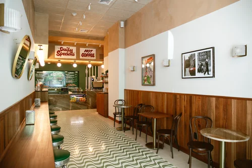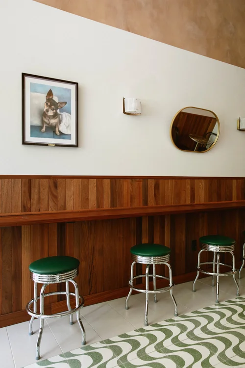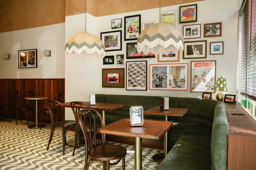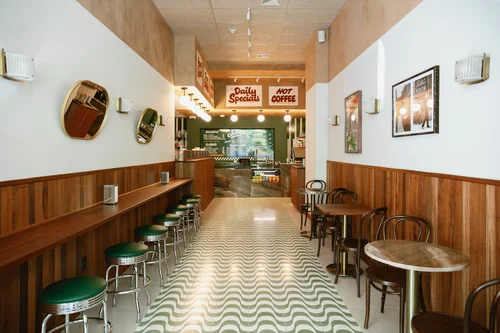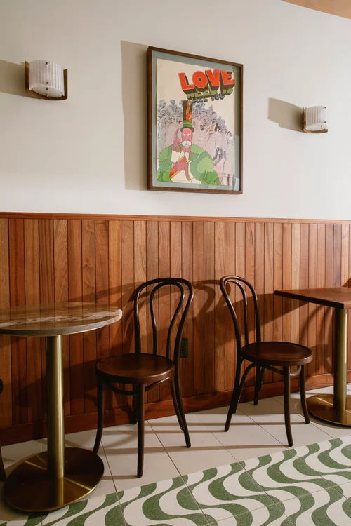 Working with Interior Designers Rebecca & Rebecca our team executed the furniture and wood finishes on Cheech’s Bagels. The glowing Sapelle furniture and millwork are further showcased by Rebecca & Rebecca’s flair and eccentric tastes in hand-painted signs, colored glass, fancy tile work and vintage photos. Located by Hamilton Park in Jersey City.